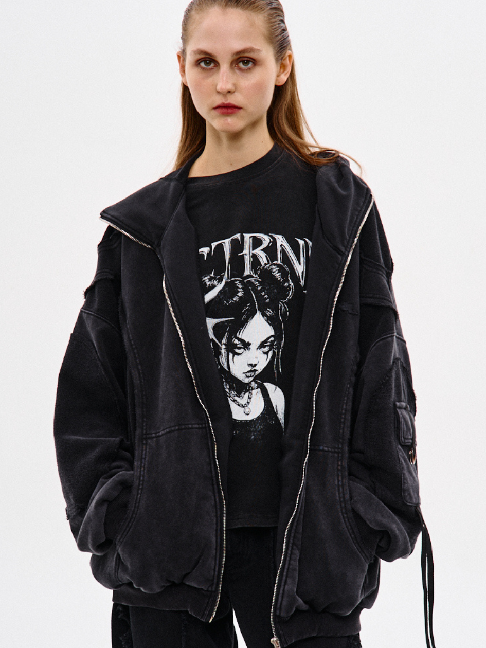 Худі на блискавці оверсайз крою з рельєфами по всьому виробу. Має накладну кишеню на лівому рукаві. Виріб виконаний з ефектом виварювання — попереднє прання створює унікальну текстуру та легкий вінтажний відтінок. М’яке, об’ємне й водночас структурне — худі, що виділяється навіть у базовому образі.